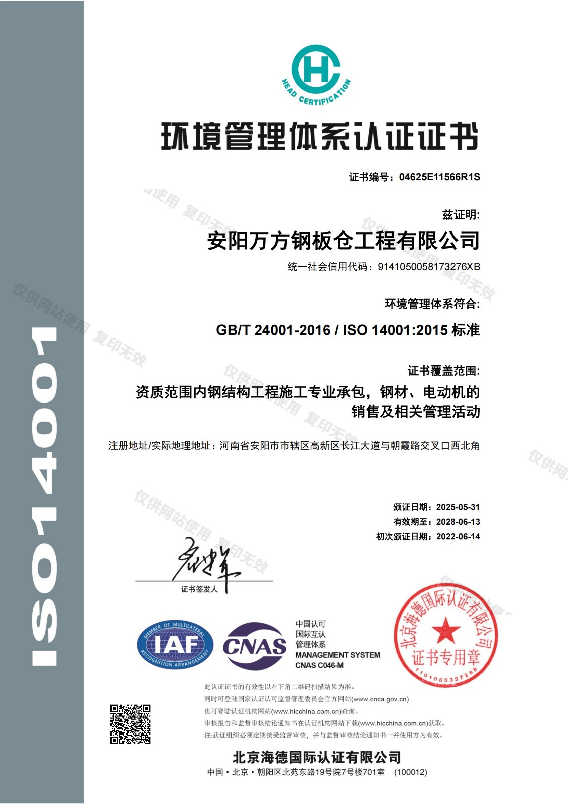 環(huán)境管理體系認證證書